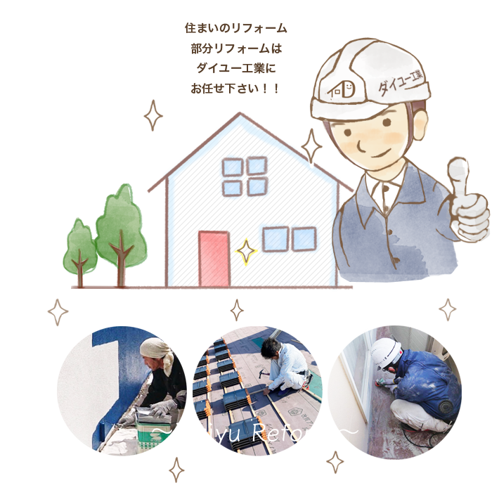 快適空間のお手伝いをします!ダイユー工業では、主に一戸建て住宅の経年劣化などによる老朽した部分、屋根・外壁・水周りなどをお客様の要望によって、修繕・改修工事を致します。大規模な改修工事から部分的な修繕工事まで、何でもご相談ください。
